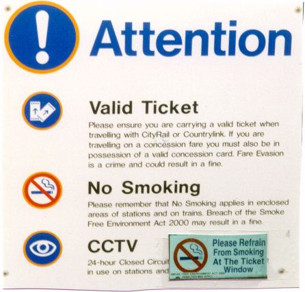 Our platform vigilantes are taking a well-earned rest while this battle turns into a paper war with politicians and bureaucrats. We have now sent three rounds of 122 letters to all members of NSW Parliament. These focussed initially on the issue of railway staff either neglecting or refusing their duties. No one seemed too interested in that. Then we challenged the Minister to say whether his adoption of the new Smokefree Environment Act in place of his own more onerous byelaws was a deliberate step backwards to allow smoking in non enclosed areas where it was previously banned or whether it was just a slip-up by his administration. We pointed out that the new signs being installed on railway stations are actually incorrect and therefore illegal There seems to be some real interest in this aspect but it has all accumulated in the Minister's "too hard" basket.