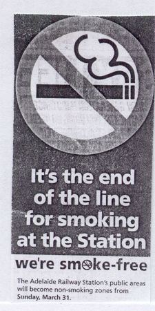 Lollypops were offered to rail commuters on 1 March 2002 as a healthier alternative to smoking, which is now totally banned inside the Adelaide Railway Station. It is some strange form of intimidation that authorities seem to feel they have to be apologetic and sympathetic to smokers on those rare occasions that they try to curtail their pollution. Perhaps that is what is holding up the long overdue decision in NSW - Minister Carl Scully can't afford the cost of the lollipops with an election looming.