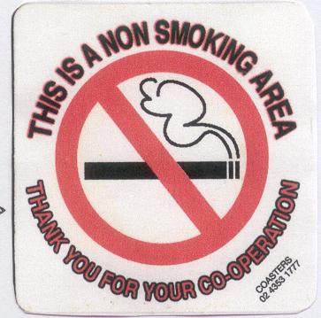 We did it, so can you Sweden now has smoking bans in all indoor workplaces, since July 2005. India :See previous article about bans on smoking scenes in Indian films. Scotland smoking bans to begin in all indoor workplaces, including pubs and clubs, on 26 March 2006. Czechoslovakia The Czech republic passed a law banning smoking in public places and restricting cigarette sales from January 2006. Japan the Japanese Imperial Palace will end a century old custom of presenting gifts of cigarettes to official staff and palace volunteers in March 2007, due to the harm of smoking. It makes you wonder how recipients feel about their gifts from now until the 2007 "deadline". According to Finance24, British American Tobacco manufactures cigarettes in 64 countries and produced 853 billion cigarettes last year. The company, as well as other Western tobacco companies, are trying to expand beyond the region, where several countries are enacting public smoking bans and restricting advertising. The deadly tentacles continue to reach out. "Sir Thomas Beecham was travelling in a No-smoking compartment of a train ( remember those?) A woman opposite him lit a cigarette and said "I'm sure you won't mind if I smoke." Beecham: "not at all provided you don't mind if I'm sick" Undeterred, Madam said "You don't seem to realise who I am. I'm one of the director's wives. Beecham: "Madam, if you were the director's only wife I would still be sick". SMH 27-Jun-1982 Consumer Report, from NSMA member. Negative attitude to new Non Smoking Laws On Sat.23rd July, we were looking for a quiet drink in Newtown (near Sydney). Passing by Kelly's Bar on King St., we noticed ashtrays on all available tables, so decided not to run the gauntlet to find the non smoking area, but walked further along and noticed the Zanzibar, which we had been to several times before, was plastered with non smoking signs in the downstairs bar, so we decided to go in. We ordered a couple of drinks and sat down thinking how nice this was at last when I noticed a sign at the bar. I wrote it on the back of one of their bar mats. "Due to customer complaints to the Health Department this area is temporarily non smoking. We will rectify this as soon as possible". We asked the barman about the sign. We said that we liked the non smoking bar and suggested that there was nothing to fix. He mentioned the drop in custom. We said that it was because they didn't market to the 83% who don't smoke but instead to the 17% who do. His eyes glazed over in disinterest and he said we should talk to the manager, who conveniently was not there at the time. So we wrote two letters, one to the manager and one to the Licensee. We eagerly await their replies.