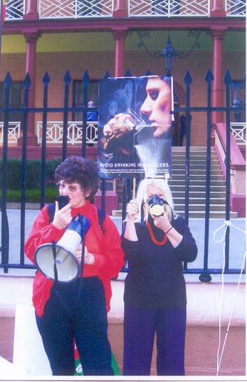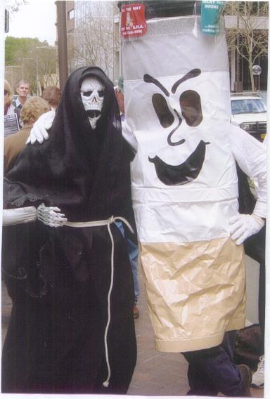 The Grim Reaper and Mr Butts Protest Rallies We continue to make ourselves seen and heard at various venues, mostly at Parliament House and various pubs and clubs, and Corporate Annual General Meetings. Direct action gives us the opportunity to contact the public and to call attention to our aims, to gain every body's rights to clean smokefree air. Members can contact us at the office or by e-mail to organise others nearby to join in. Banners supplied.