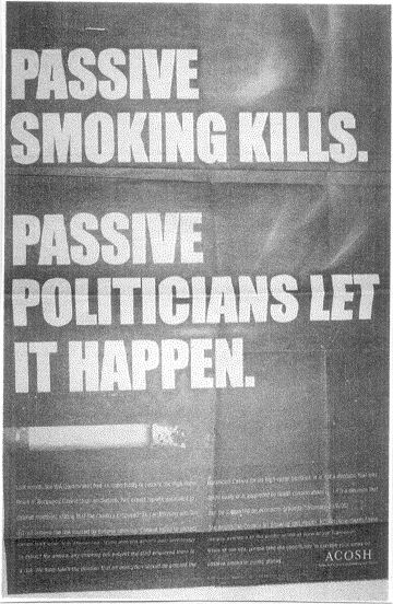 Passive Smoking Poster NSW Parliament's Joint Select Committee Inquiry into Tobacco Smoking Several NSMA Members attended and spoke passionately about their particular tobacco-related experiences and of every body's rights to clean air. Extract from NSMA Submission and Presentation to NSW Government Committee."We also call on the government. to assist people to protect their rights to clean air in their homes. .... Nobody should have to barricade themselves and their families into their homes to avoid assault from their neighbours' secondhand smoke......