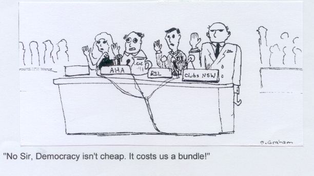 Avalon RSL, previously smokefree outdoors, now taken over for smokers. Tobacco's Stranglehold on Pubs, Clubs and Pollies Tobacco companies have apparently been assisting pubs and clubs to ensure that smokers are "accommodated". The "hospitality" industry is so greedy for gambling income to boost their profits that they will do almost anything to hold onto every smoking gambler who has so far regarded pubs and clubs as their "last bastions" for indulging in their tobacco addiction. Hence, the Smokers' Palaces which have been frantically added onto pub and club premises. Pubs and Clubs have disregarded workers and non-smokers to date but now need their support as well to pay for these ridiculous additions which will of course allow noise and smoke to billow out into neighbouring areas. Democracy isn't Cheap - No, Democracy is Priceless !! While Victorian and NSW smokers sulked about being "discriminated against" on 1st and 2nd July 2007,and having to go outside to their newly built "Smokers' Palaces" pub and club bosses continued to deny the "H" word - Health. It seems the only time they came near it was when they initiated the scare campaign that children will be exposed to secondhand smoke if smokers go home rather than stay at pubs and clubs. John Thorpe, President of Australian Hotels Association (AHA), last year declared that "Democracy isn't cheap" following negotiations with NSW Labor Government which led to the farcical definition of outdoors as being up to 75% enclosed. AHA is a major sponsor of NSW Labor. More recently, some Local Councillors have delayed pub and club Development Applications for smoking areas, asking pesky questions about health and safety and secondhand smoke and noise in the neighbourhood. As a result, John Thorpe has suggested that AHA might not sponsor prospective local councillors in the next elections. Could it be that local government hopefuls don't want any of AHA's tobacco-tainted funding, and that, in fact, democracy is priceless?