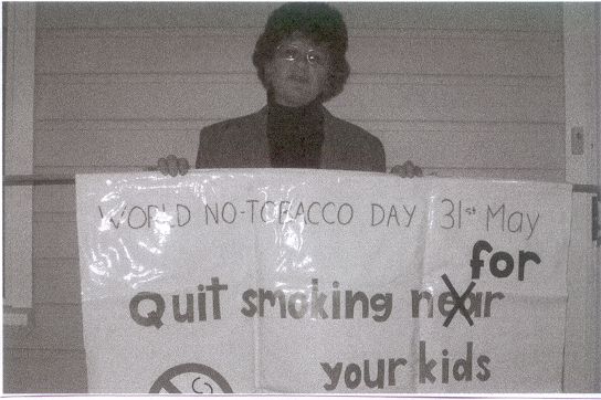 We paid tribute to the many battlers who had fought for clean, smokefree air in all public places and particularly in the so-called hospitality industry. These included Sue Meeuwissen who had won her discrimination case against the Hotel Hilton 10 years before. Other heroes are Marlene Sharp, Steven Kane (the Masked Barman) from Moama and Phillip Edge, from South Australia. World No Tobacco Day 31 May 2007 Another day of saying to the kids "Don't do this you'll die!", then lighting up another cigarette. Smokers - How do you think your kids feel when they watch you light up? It's just like holding a gun to your head in front of the kids, only when you smoke, the kids cop the bullet as well, from the toxins in secondhand smoke. Quit Smoking Near your kids. Better Still, Quit smoking For your Kids ! On World No-Tobacco Day, NSMA volunteers demonstrated this message and distributed flyers at Channel Seven's morning telecast, as well as at a local shopping mall, a public hospital and an RSL Club. World Health Organisation (W.H.O) specifically supports smokefree environments on World No Tobacco Day 31 May 2007and spells out the basic Human Right to clean air, free from the poisons in Secondhand smoke.
