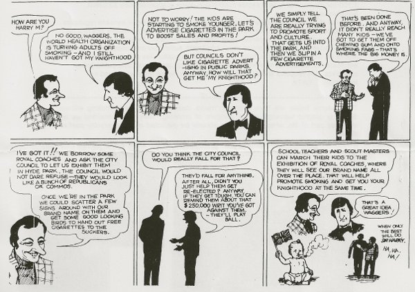 Casey Stoner Tobacco Out of Sight in Shops: Information from ASH (Action on Smoking and Health) Australia. ACT, NSW, Tasmania and Victoria have legislated to end tobacco displays in shops. * ACT for all shops except tobacconists by end-2009, tobacconists by end-2010; * NSW for large shops by end-2009, smaller shops by mid-2010, tobacconists by 2013; * Victoria by Jan. 2011; * Tasmania for all but a few tobacconists by Feb 2011. The WA government also has legislation before parliament; NT has foreshadowed it and Qld is considering it. International News from Big Tobacco, links with Australia. Philip Morris Manager Interviewed The following are excerpts from an interview with Managing Director John Gledhill of Philip Morris Korea Inc. conducted by The Korea Post on the occasion of his winning a Commendation Award of the Minister of Commerce, Industry & Energy of the Korean Government on the 2nd Foreign Company Day on Dec. 9, 2002. Question: Please explain briefly Philip Morris' contributions to the Korean economy. Answer: Philip Morris, the producer of Marlboro, the world's No. 1 selling cigarette, is committed to the Korean community and the Korean marketplace. In 2001, Philip Morris Korea Inc. (PMK) contributed 250 billion won (US$209 million) in excise and education taxes and other related funds to the nation's tax revenue. We are also contributing to the local economy by creating job opportunities. As part of societal alignment efforts, since 1999 the company has donated a total of eighteen refrigerator trucks to the Food Bank network nationwide to help fight hunger. John Gledhill (head of PMI in Australia 2004-2009) is currently head of Philip Morris in Indonesia and was questioned by ABC's Foreign Correspondent about his conscience and selling tobacco to minors in Indonesia. John Gledhill, who has just moved from Australia, says his conscience is clear. "I work for a company which I believe not only follows the law by the letter but also the spirit as well," he said. British American Tobacco picks new chairman(AFP) August 18, 2009, London - British American Tobacco, the world's second biggest cigarette maker, said on Wednesday it had appointed Richard Burrows, who resigned as head of ailing Bank of Ireland Group, as its new chairman. The Irishman succeeds Jan du Plessis who leaves BAT to become chairman of Anglo-Australian mining giant Rio Tinto. Burrows, who has spent much of his career in the alcoholic drinks business described his latest appointment as "such an exciting opportunity at such a world class company". Overheard at young women's rowing team training session. Coach: You know that cigarettes can kill you. But don't worry about the smoking killing you - if I catch you smoking, I'll kill you. Our politicians need educating: Letter from M. Hogge to The Editor, as printed in the Manly Daily Tony Abbott Federal MP and shadow Minister for Health, thinks smoking in the car with kids is trivial, and that it's tantamount to NannyState Politics to ban it. (Sydney Uni. Public Health Debate, 1 July 2009) Well - this, as Professor Terence Stephenson, President of UK's Royal College of Paediatrics and Child Health, says, is "legitimate Nanny Territory". And you, Mr. Abbott, should stop suckling on Big Tobacco's Donations Teat and go to the Naughty Corner. Don't come out until you've written 16,000 times "Smoking Kills and Secondhand Smoke Kills" Weasel words from British American Tobacco Australia (BATA) Sensible Regulation of Tobacco British American Tobacco (BATA) is Australia's leading tobacco company, accounting for 45.5 percent of the tobacco market in Australia. The company manufactures and distributes cigarettes and roll-your-own tobaccos; it also distributes pipe tobaccos and cigars. Our brands include Winfield, Benson & Hedges, Dunhill, Pall Mall, Holiday, Kent and Lucky Strike. We have operations in every Australian state and territory, and directly employ over 1,100 people and our federal excise contribution alone is approximately $3 billion. Because of the real and serious risks of smoking, BATA supports the sensible regulation of tobacco products. In BATA's view, sensible tobacco regulation considers and reflects the differing needs and preferences of all affected stakeholders including consumers, tobacco retailers, hospitality providers, public health authorities and tobacco companies. Above all, we believe that the hallmark of sensible regulation lies with its workability and enforceability, as well as its ability to demonstrate clear and measurable public policy objectives. Any proposal should meet this benchmark before being enshrined in legislation. Smoking in the media The pictures below are from everyday media stories - they depict smoking without depicting graphic warnings of the dangers of smoking. They show smoking as an everyday part of life, whereas smoking should be depicted as an everyday part of death.
