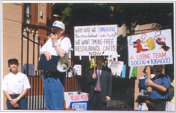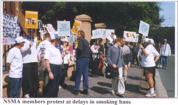 The Premier Bob Carr and his smoking health Minister, Andrew Refshauge, conned the people of NSW with the Smoking Regulation Act passed in May 1997. This was the message delivered by NSMA President, Brian McBride, at a rally of members at NSW Parliament on Wednesday 22 September 1999. How else can we explain that after two years delay no progress has been made towards implementing that legislation. At that time the smoking Health Minister had no intention of doing the necessary things set as a pre-condition, namely creating a new Air Quality Standard so the "five year clock" could at least start ticking. If Andrew Refshauge was still Health Minister he would be squirming under the obvious proof that it was all just window dressing as far as he and Bob Carr were concerned. Of course in the typical cynical fashion of politicians he is no longer in the hot seat and the new man Craig Knowles has the problem. Again in the time-honoured practice of politicians the new man has to be allowed time to get up to date with things and everyone is expected to be reasonable and accept these excuses for inaction. PETITION TO BREAK ROADBLOCK We are not going to accept these delays and we have collected petition signatures demanding some action. One of the two petitions presented to Dr. Arthur Chesterfield-Evans for tabling in Parliament called for the legislation to be amended to bypass the delay caused by the new Air Quality Standard, which seems to be in the "too hard' basket, and simply impose the smoking bans on all enclosed public premises. After all, common sense tells us that any level of smoking would not meet any sort of reasonable air quality requirements so why agonise over wanting this "standard" to justify imposing the bans. Did we have to have an air quality standard before banning smoking in buses, trains, aircraft etc.? Of course not! Did we have to have a five year lead-in time to ban smoking in the workplace after it had been proved to be an occupational health risk? Of course not ! These are simply delaying tactics fed into the process by the pro-tobacco lobby and gratefully accepted by our wimpish politicians so they can put off the hard decisions a bit longer. Other important measures are detailed in the petition: a) To increase taxes on tobacco to pay for a more extensive and sustained TV and print media educational program to discourage young people from taking up smoking. b) To hold tobacco companies directly responsible for the misery and death they are causing by commencing legal action to cover Federal and State health costs (Note the great legal initiatives reported below are non-Government actions). c) To make tobacco companies provide detailed information about the increasing range of chemicals and additives in cigarettes and display them at all points of sale. PREMIER STATE RUNS LAST ON CLEAN AIR