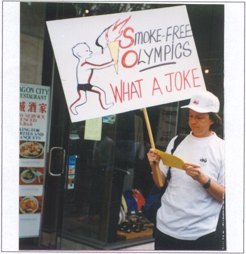 ATHLETES CALL FOR GREINER'S RESIGNATION FROM OLYMPICS The second petition was presented to Dr. Arthur Chesterfield-Evans by former Australian and British squash champion, Ms Caren Clonda. She spoke on behalf of a group called "Athletes against asthma". Caren says that approximately 17% of athletes suffer some level of asthma and their attacks are often triggered by cigarette smoke. She strongly attacked the role of a tobacco company chief like Nick Greiner who has no right to be associated with the Olympic Games which is all about promoting good health through sport. The petition calls for the Minister for the Olympics, Michael Knight, to remove Mr. Greiner from the management Board, SOCOG, forthwith. He is Chairman of WD & HO Wills which contributes to the 18,200 Australian deaths each year not to mention the millions of deaths around the rest of the world. The global death toll is now one death every eight seconds and it screams out for civilised people to get serious with these deadly drug pushers. The whole idea of honouring a tobacco killer by giving him a prestigious position in the Olympic organisation is repugnant to thinking Australians. The petitions were presented to Dr. Chesterfield-Evans because the Minister, Michael Knight, declined to accept them. In fact he would not even reply to our letters. Action Point 2. Write to The Hon. Michael Knight, Minister for the Olympics, Parliament House, Macquarie St. Sydney, 2000. Tell him that Nick Greiner's tobacco role will continue to do great harm to Australia's reputation before the eyes of the world. MIKE GIBSON LASHES SMOKERS Mike Gibson did his usual good anti smoking coverage in response to the media release put out regarding the protests at State Parliament House. He announced the event as part of the "promos" of his upcoming program right from 8.00 AM. He arranged to interview Brian McBride on air shortly after his program started at 10 AM and gave all the issues a good airing. This was partly because the papers were running a piece about politicians smoking in their offices while all their staff were banned. He named the offenders including Peter Reith, John Fahey, Michael Egan, Sandra Nori, Eddie Obeid and Kim Yeadon. 2GB then used excerpts from Brian's interview to replay in their later news bulletins which gave wide publicity to the attempts to get Nick Greiner sacked from the Olympics Board. An audience of over 300,000 kept hearing these calls to sack Greiner and this was a guaranteed way to ensure the Premier and Minister Knight could not continue with their heads in the sand pretending it was not an issue. NSMA JOINS TCC LEGAL ACTION This is an historic step taken by Australian pro-health forces as announced on Monday 3 October 1999. The Movement is pleased to advise members that we are one of the sixty health - anti tobacco organisations forming the new Tobacco Control Coalition (TCC) which has started action against Australian tobacco companies in the Federal Court to recover $500 million per year in compensation in the form of a fighting fund. The action is modelled on successful legal actions by the State health authorities in the USA which achieved payments to cover the costs of future programs deemed essential to reduce the proven damage caused to date. Why should any Government or private health oriented bodies like ours have to foot the bill for preventive measures only made necessary by the negligent, criminal, misleading and deceptive practices of our own Australian tobacco companies? The state level action in USA resulted in a record payout of over $300 Billion dollars in compensation for the state health costs of treating smokers. Now President Bill Clinton has announced a Federal level action to recover their costs as well. This is analogous to the potential federal and state actions which could be started in Australia. Of course Prime Minister John Howard and his Liberal party colleagues are too close to the tobacco industry to rush in with federal action but everyone, including NSMA have urged him to do it. However it is great to see that Dr. Andrew Penman, CEO of NSW Cancer Council, Anne Jones of ASH and Prof. Simon Chapman have worked tirelessly to bring about this action through the vehicle of the Tobacco Control Coalition. Philip Morris, of course, said the case won't succeed because tobacco taxes more than pay for any health damage. Simon Chapman issued a quick rebuttal to the media and pointed out that - as usual Philip Morris is being duplicitous. They argue that there is no evidence that smoking harms anyone, but anyway its taxes pay for the health damage it claims does not occur. It argues in effect that the tobacco industry can run up health bills equal to the tax revenue of $4.5 billion a year and then walk away scott free! Well let us see how that logic stands up in an Australian court. A particular thank you should go to the Board of the NSW Cancer Council for having the courage to back this great initiative. Whatever the outcome it shows that we are all getting more serious about the fight against tobacco which is long overdue. VOTE NO TO K. GREINER FOR LORD MAYOR Our dedicated team took to the streets in Martin Place, Sydney on Monday 30 August 1999 to hand out leaflets in relation to the Sydney City Council elections. The photo shows our team dressed in eye-catching cigarette packets originally designed for the Carla Zampatti rally on 31 May 1999. We handed out leaflets urging people not to vote for Kathryn Greiner in her bid to become Lord Mayor of Sydney. It was not that we supported any other particular candidates, but we simply attacked Kathryn because she had repeatedly said through various media interviews, particularly radio, that she had discussed City fundraising with husband Nick, and if elected she would involve him in these affairs of Council. Nick, as we all know is Mr. Tobacco in Australia since he is Chairman of the multinational giant WD & HO Wills which now also controls t